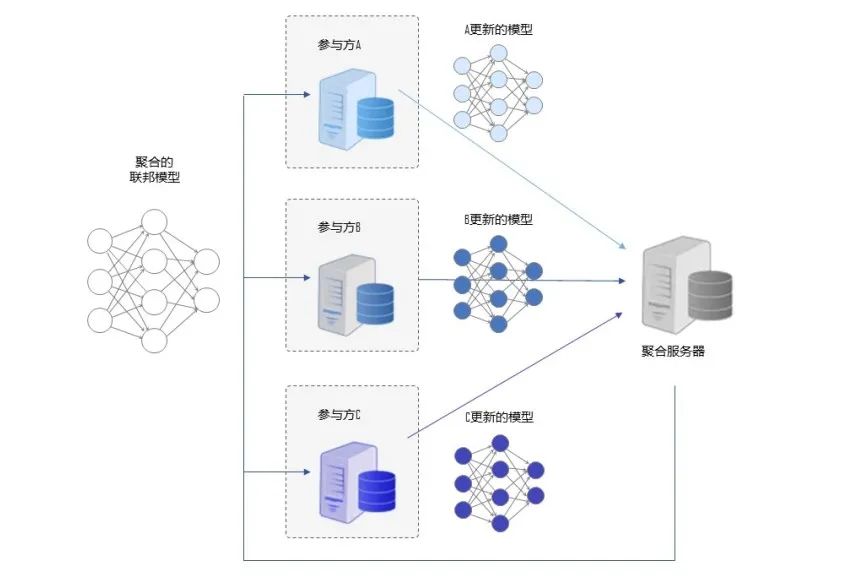 在客户-服务器架构中,协调方是一台聚合服务器,其可以将初始模型发送给各参与方A~C, A~C分别使用各自的数据集训练该模型,并将模型权重更新发送到聚合服务器。聚合服务器将从参与方处接收到的模型聚合起来,并将聚合后的模型更新发回给参与方。这一过程将会重复进行直至模型收敛或达到最大迭代次数。这里参与方的数据不会离开自己,保护了参与方的隐私和数据安全。