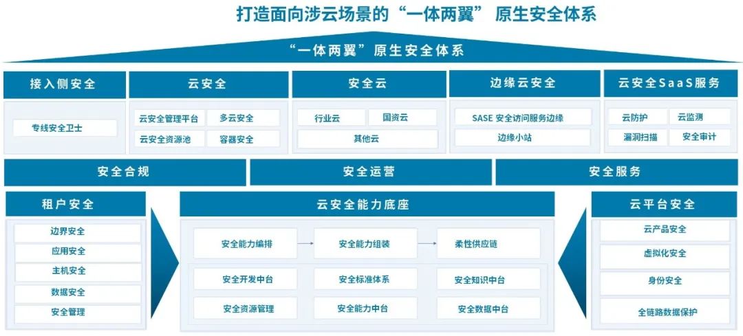 在涉云基础设施安全方面,威廉希尔500欧洲指数与中国移动紧密合作,将安全能力作为基础设施和云基础设施融合,融入移动云构建原生安全底座,共同打造“一体两翼”的原生安全体系。一体,就是构建一个云安全能力底座;两翼,一翼保障租户的安全,一翼保障云平台自身的安全;一体两翼,即以一个安全体系同时赋能云自身安全和开展对外云安全业务。