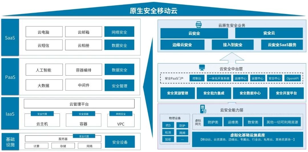 同时,基于移动云IaaS和PaaS构建的原生安全底座,威廉希尔500欧洲指数可在移动云上提供面向IaaS、PaaS和SaaS安全的原生安全能力,以安全能力池、安全能力中台、可组装安全应用三层框架帮助用户进行涉云安全能力建设。