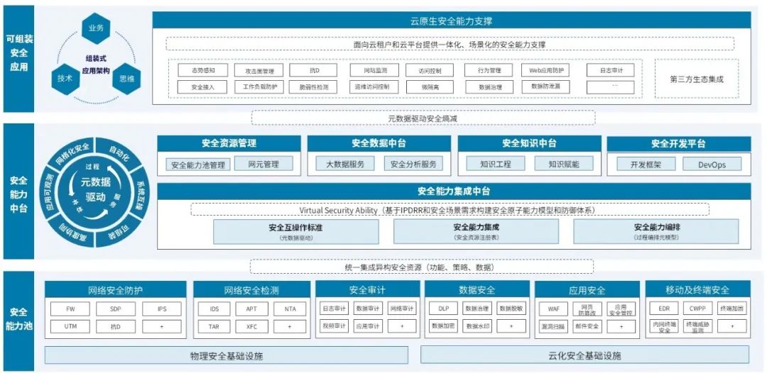 基于安全IaaS层和安全PaaS中台之上构建弹性可组装的安全业务,用于保护平台安全及租户安全,包括态势感知、数据安全管控、攻击面管理等;另外可提供云安全运营体系,包括运营、管理、考核等。