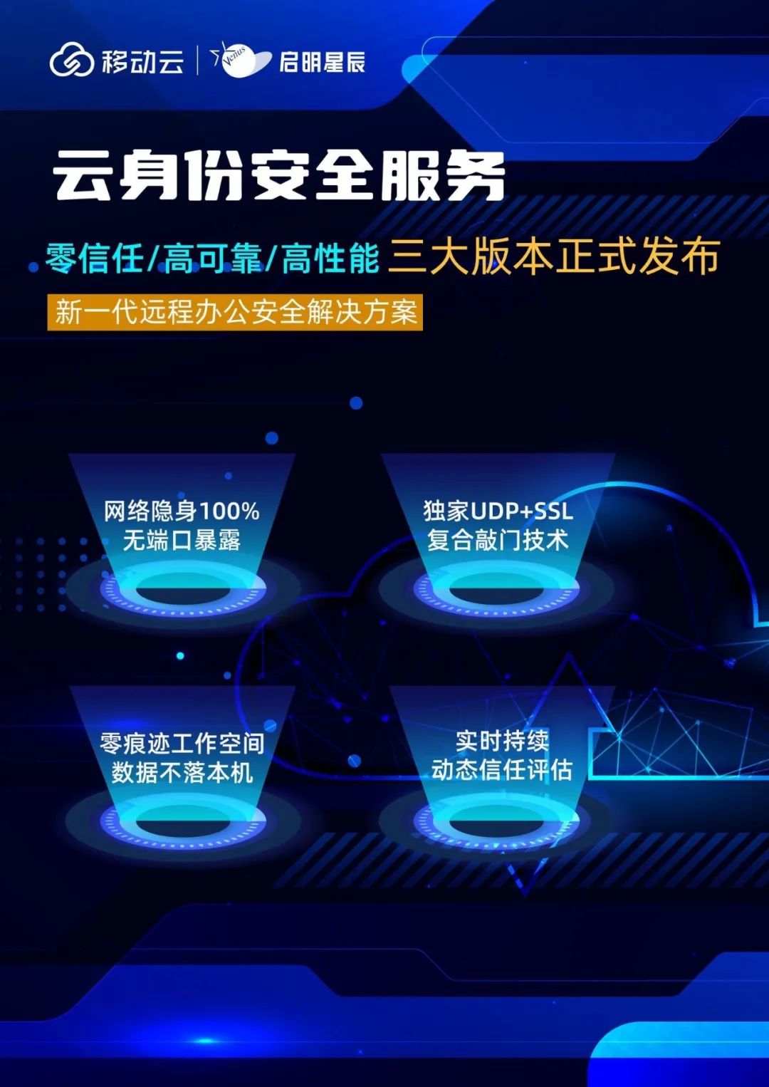 云身份安全服务采用零信任最佳实践SDP,以及业界先进的复合敲门技术,完全网络隐身,100%无端口暴露;支持国密超级SIM认证,与公网彻底隔绝;对用户/机器行为持续监测、动态授权,永不信任;解决远程办公、远程运维、内网加固安全难题。