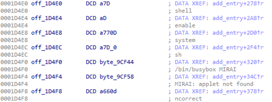 运行后,打印字符串"listening tun0",并通过监听31212端口,实现单一实例运行。之后通过异或解密出字符串资源,与Mirai的字符串高度重合: