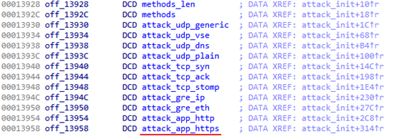 但Mbedbot比Mirai多一个针对https协议的DDoS攻击类型attack_app_https,同样使用mbedtls库,这也是首次发现支持https协议的DDoS攻击。