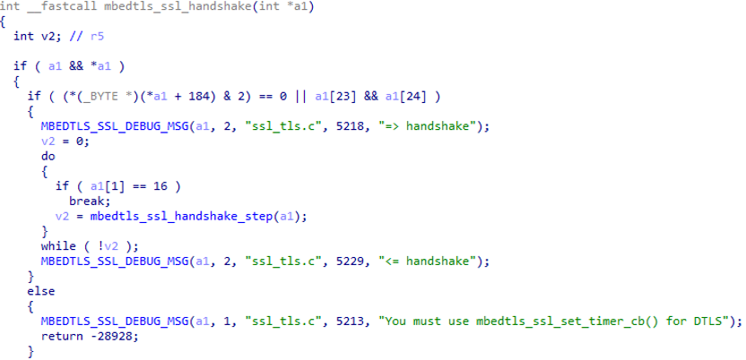 完成上述操作后,进入和C2交互通信的循环函数。在交互函数里,首先通过异或解密出C2地址,并使用tls协议和C2建立通信。tls类库为mbedtls,其前身是PolarSLL,现已被ARM公司收购,由ARM技术团队维护更新。
