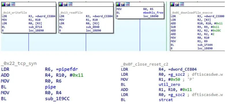 Mbedbot实现了很多后门功能,包括文件类(创建读取上传下载执行),执行shell进程,DDoS攻击,结束指定进程,重置C2服务器,退出自身进程等。