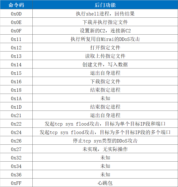 Mbedbot完整复用了Mirai的DDoS代码,并在其基础上新增两个“自研“的tcp syn攻击以及https ddos攻击能力。并且,针对自身的后门功能进行了丰富,以尝试加强对bot主机的控制能力。