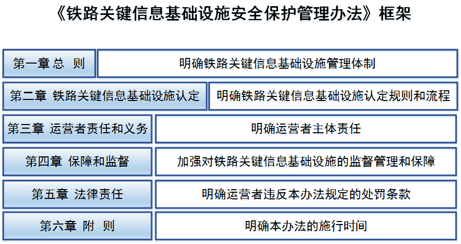 《办法》共6章30条,包括总则、铁路关键信息基础设施认定、运营者责任和义务、保障和监督、法律责任、附则。主要内容包括: