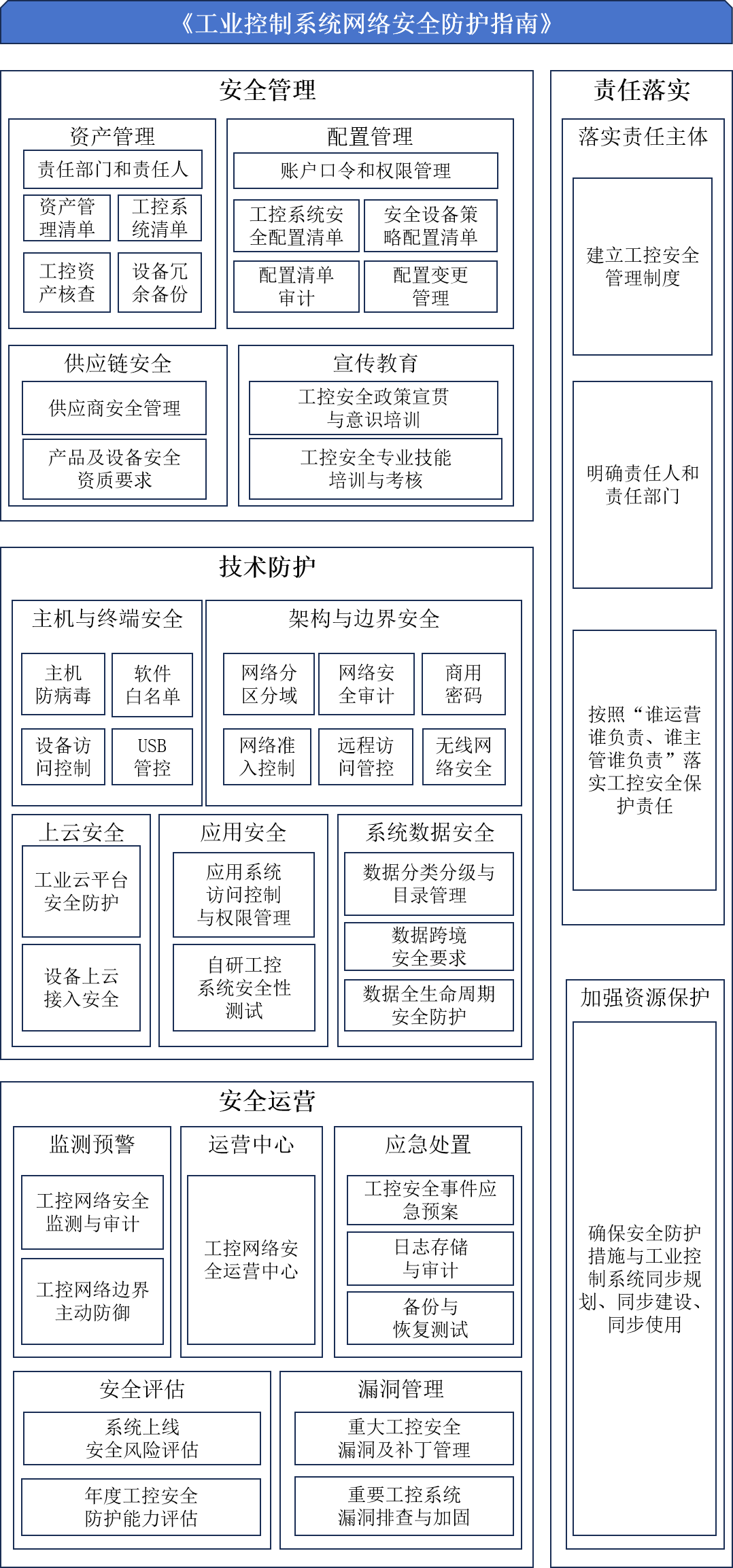 在责任落实方面,《指南》也从安全监督的角度,对工业企业的工控安全责任进行了统筹规划,严格遵循“谁运营谁负责、谁主管谁负责”的原则,有效落实工控安全保护责任,并按照三同步原则加强企业资源保障力度。