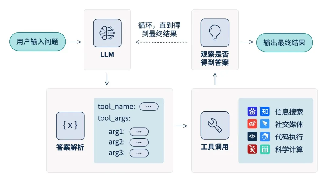 在智能体中,一个问题会被拆解为多个子模块,然后通过从大模型生成的结果中解析出其中调用工具的内容,使用多种工具来逐步完成目标。每获得一次工具调用结果,需要通过规则或大模型对得到的结果进行观察验证,确定这是否是用户想要的最终答案。如果不是,则继续循环,将历史的所有结果进行总结并输入大模型,让大模型规划下一步骤的行动。