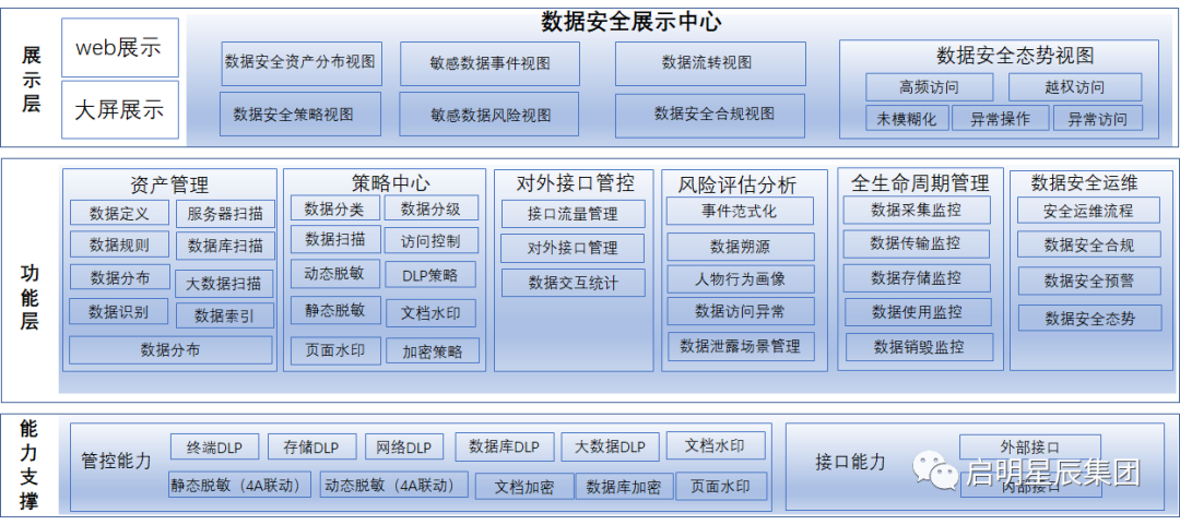 数据安全治理管控系统支持多种能力组件,包括主机敏感发现、数据库敏感数据发现、大数敏感数据发现、访问控制、数据加密、数据脱敏、数据水印等多种能力组件。