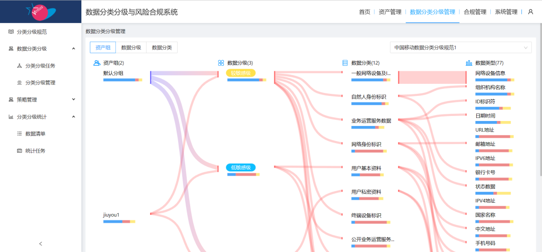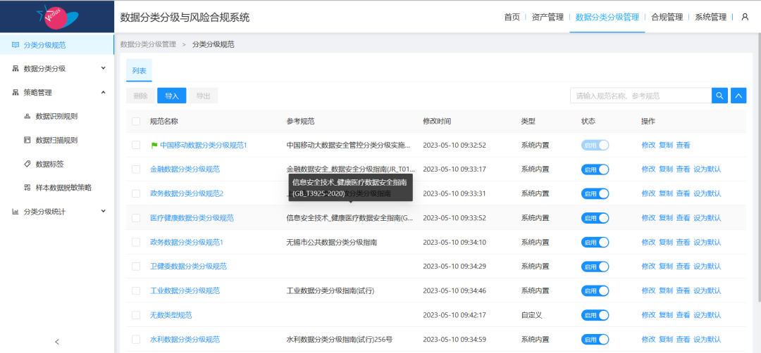 数据分类分级工具功能能力特色:内置政务、运营商、金融、证券等十多个行业分类分级规范,可同时启用多套规范。