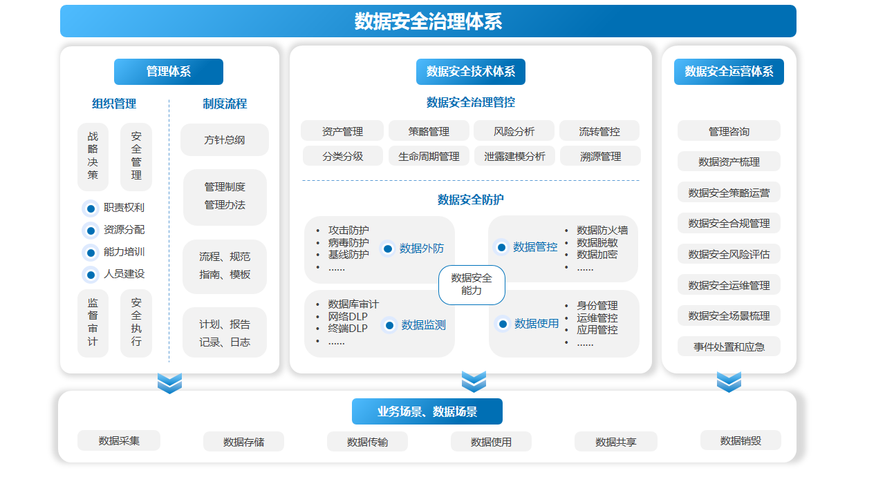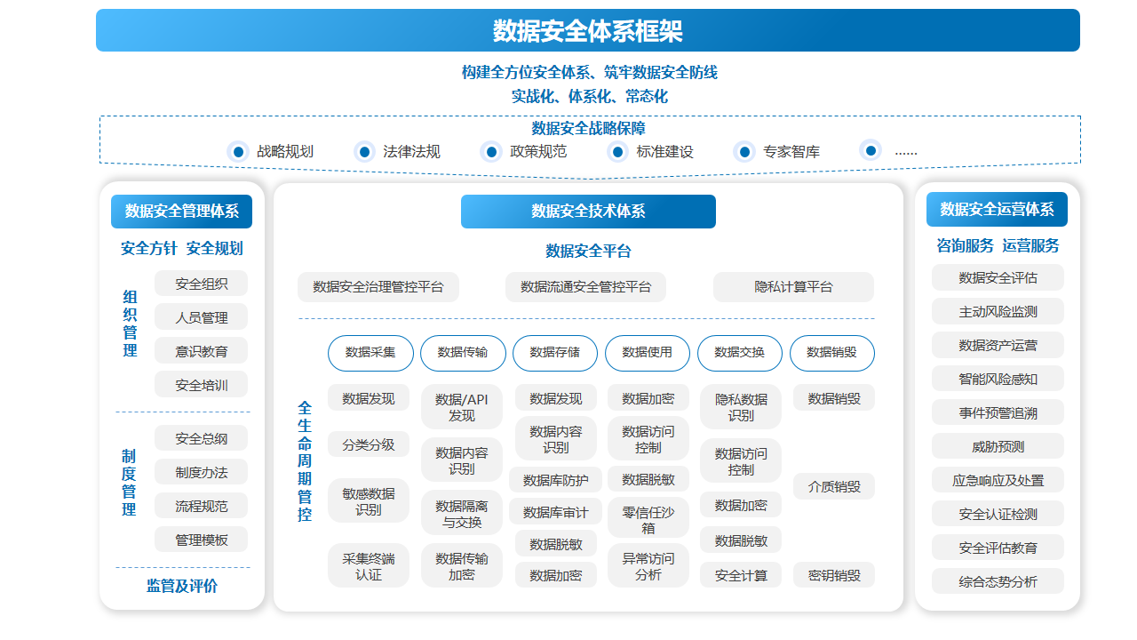 具体而言,数据安全体系由数据安全管理体系、数据安全技术能力体系、数据运营体系三部分组成。总体框架如下: