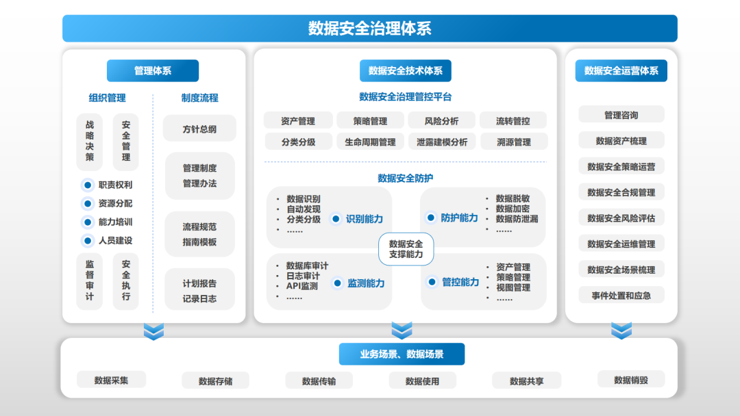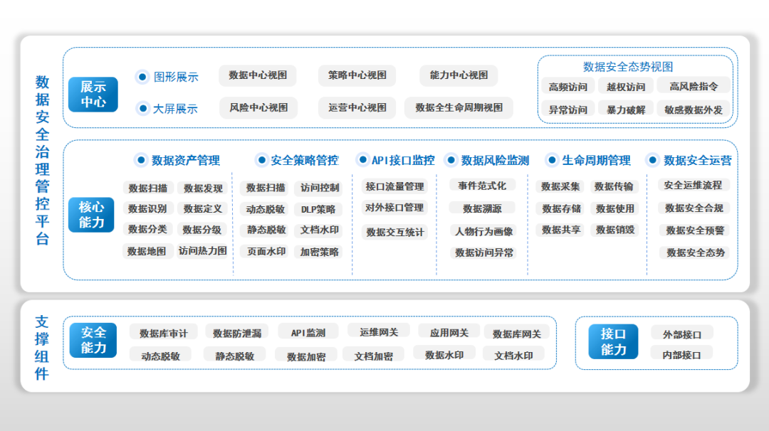 在该体系中,数据安全治理管控平台(DSMP)处于核心枢纽地位:向上承接各类制度规范的拆分和解读,使之成为具体可落地、可执行的安全策略;向下基于统一的、全局的安全策略驱动和调度各种能力组件(数据安全产品)执行各种安全策略。同时,DSMP可作为安全运营服务的平台支撑,使得制度、规范、流程、风险评估、安全能力、安全策略形成闭环,从而为数据安全构建起一套综合的防护体系。