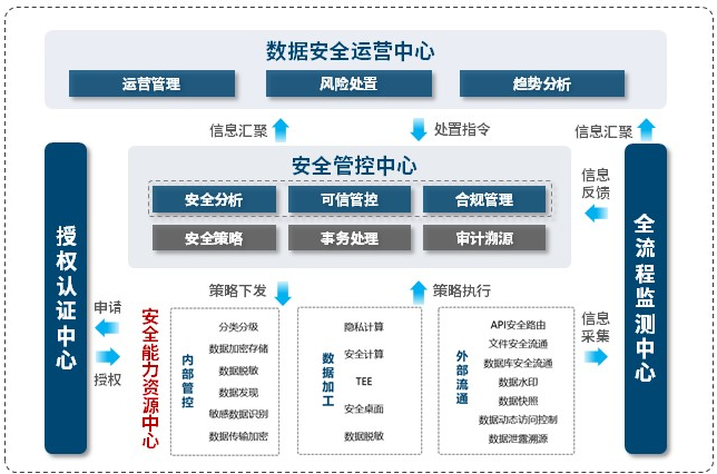 从业务域到开放域的过程中,数据安全面临更复杂的挑战,单点能力查漏补缺式建设安全能力无法提供数据的全流程贴身防护能力。威廉希尔500欧洲指数集团“安全五中心”运营逻辑从数据要素运营业务全流程的视角出发,构建安全能力资源中心、数据安全管控中心、全流程监测中心、授权认证中心及数据流通运营中心的协同体系。