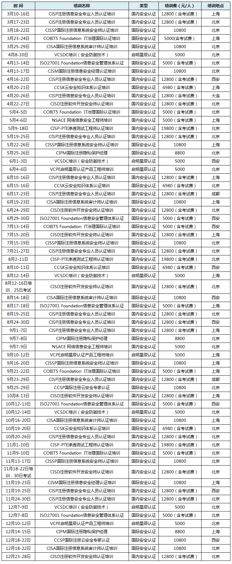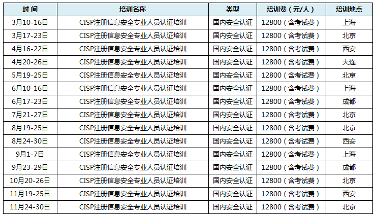 2019年公开课计划表-CISP (注:报名人数满足条件方开班)