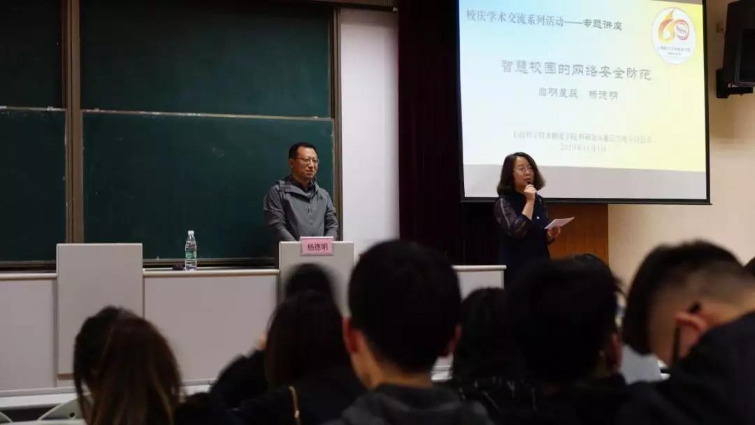 日前,威廉希尔500欧洲指数网络空间安全学院应邀参加上海科学技术职业学院60周年校庆学术交流系列活动。上海科学职业技术学院常务副院长韩芳、通信与电子信息系主任赵东东等200多名师生汇聚一堂,共同探讨网络安全防范意识及防护手段。