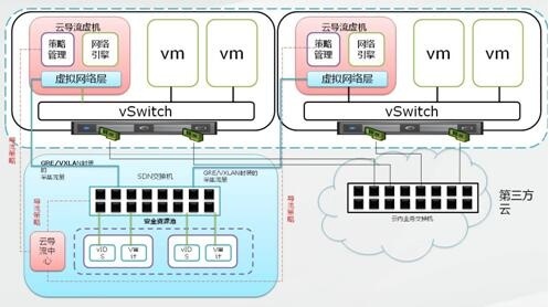 云导流中心是一个组件运行在虚拟化资源池平台的管理节点之上,可以提供对多个导流虚机的管理、监控功能,可以与智慧流平台联合使用,用于VTAP虚机和SDS交换机建立Overlay隧道。虚拟化安全资源池可提供虚拟入侵检测、虚拟数据库审计、虚拟网络审计、虚拟流安全审计、虚拟Web应用防护、虚拟VPN等多种安全能力,并可根据需求进行灵活扩展。