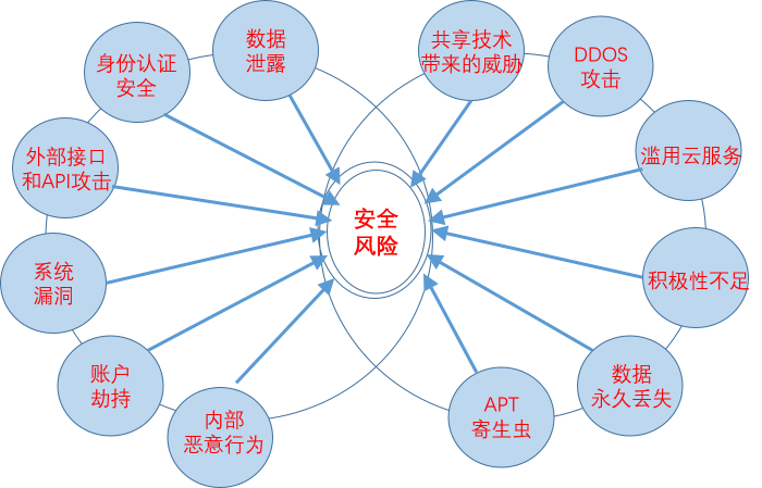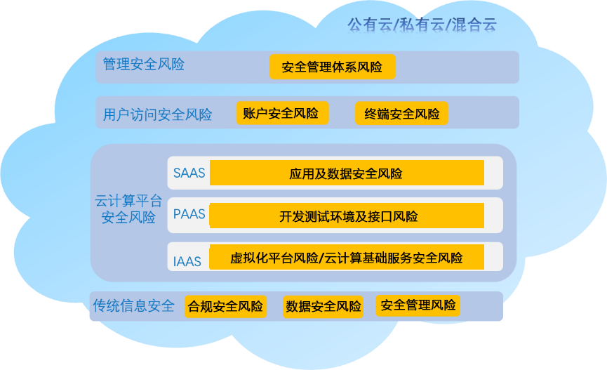 在云计算的建设以及使用过程中,每个环节都可能导致安全风险,诸如云计算平台安全、管理平台的安全等,可能导致的安全风险可以归结为传统信息安全风险、云计算安全平台风险、用户访问安全风险以及管理安全风险。