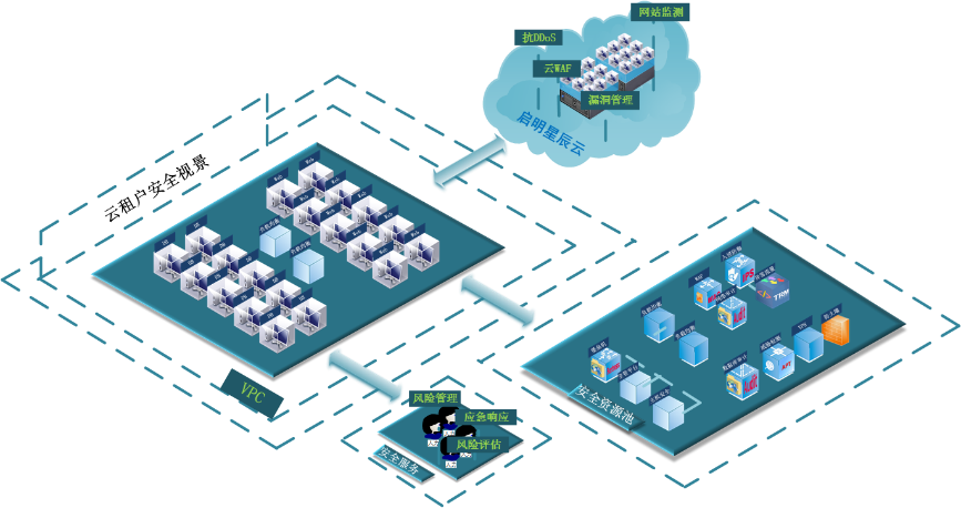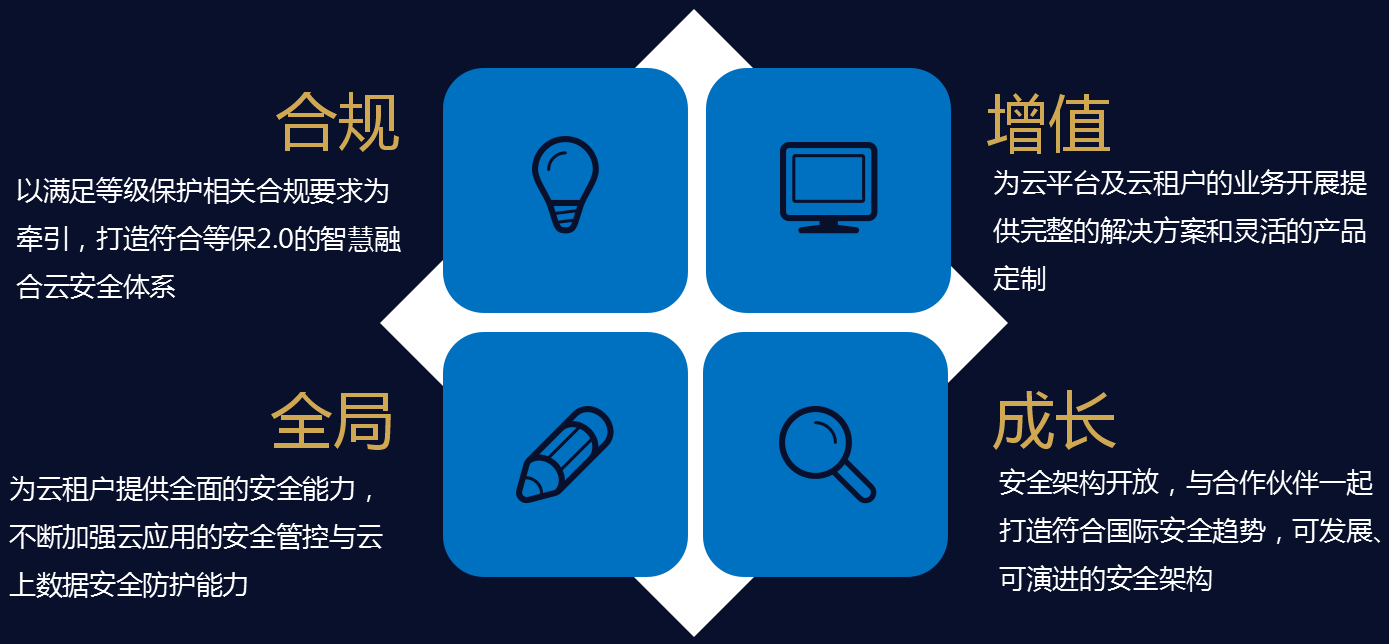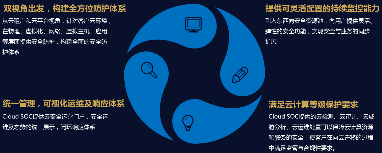 威廉希尔500欧洲指数针对云安全风险提供六大云安全能力抵御各类风险与威胁,云安全交付模式满足云平台安全和租户个性化安全,同时满足合规要求;