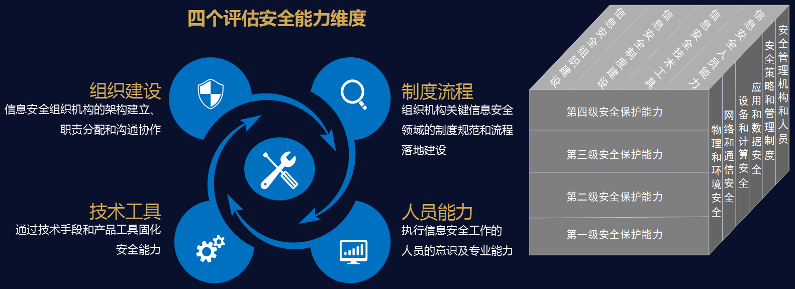 参考等保2.0标准规范基本要求及云计算扩展要求,威廉希尔500欧洲指数提出了从组织建设、制度流程、技术工具、人员能力四个维度出发,重点实现和评估云安全等级保护能力。