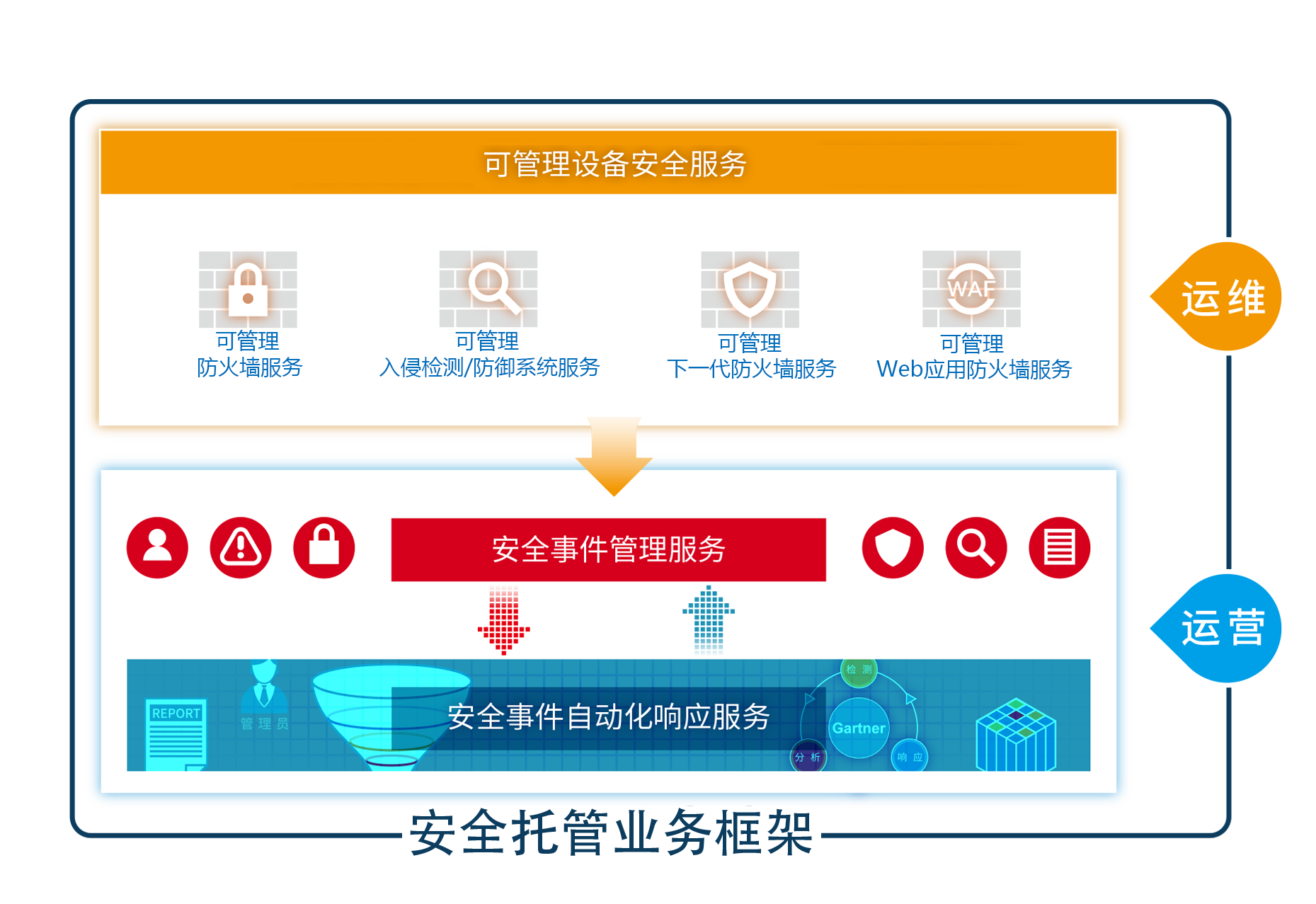 基于Gartner自适应安全架构的生命周期运营服务,为用户提供一个具备强适应性的智能安全防护体系及全方位闭环安全服务。